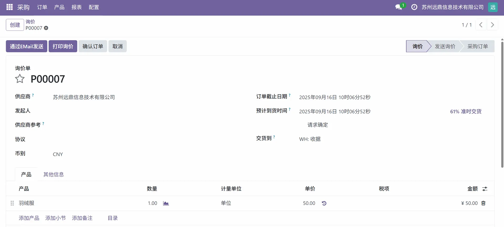 在询价请求中,有“预计到货日期”,并且“确认日期”是自动添加的。预计到货日期是订购产品预计从供应商处交付或收到的预期日期。确认日期是指采购订单被用户正式确认的日期。点击询价请求中的“确认订单”按钮,用户可以确认采购订单。通常,当点击“确认订单”按钮时,询价请求将从“发送询价”状态变为“采购订单”状态。