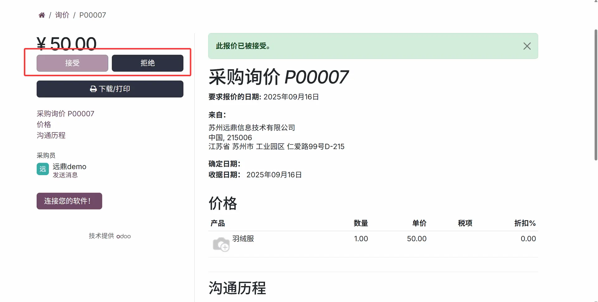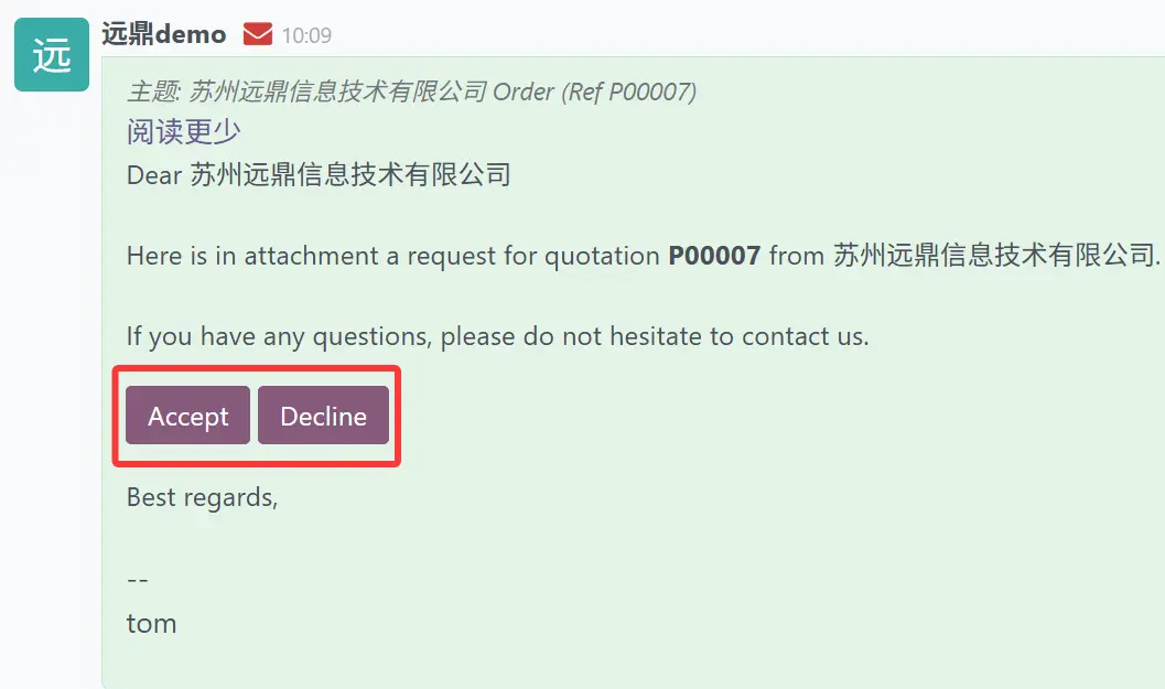 如果供应商接受了询价请求,讨论区中添加的消息将是“供应商已确认询价。”;如果供应商拒绝了他通过电子邮件收到的询价请求,讨论区中显示的消息将是“供应商已拒绝询价”。根据讨论区中显示的消息,用户可以确认该询价请求。