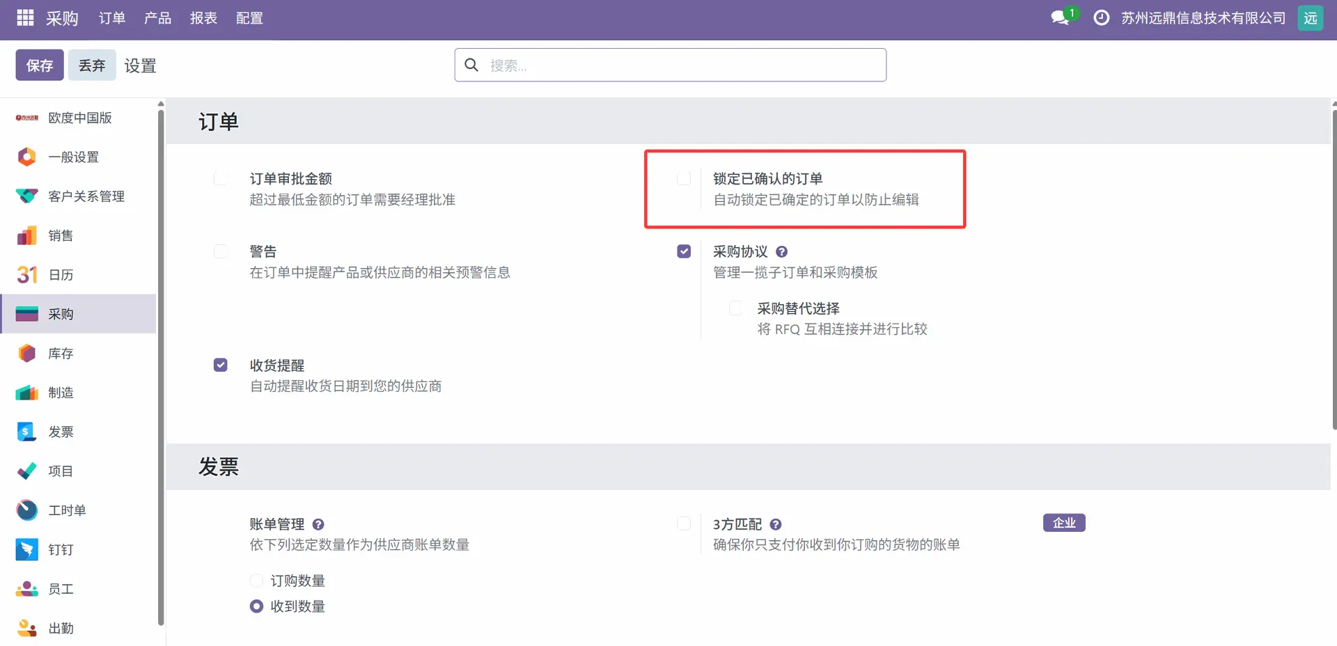 要激活此功能,请转到采购模块的 配置 > 设置。在“订单”部分,有一个“锁定已确认订单”的选项。