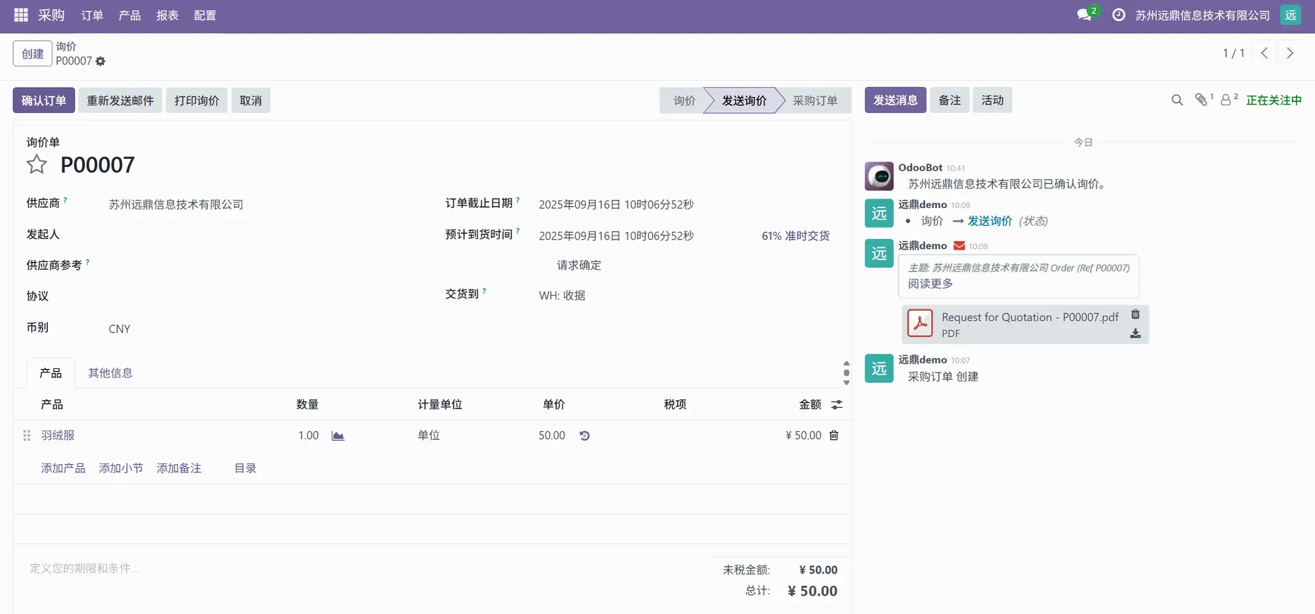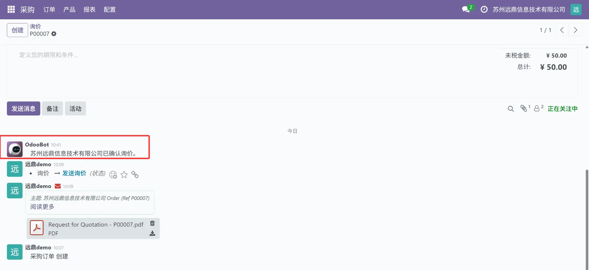 然后当返回到采购订单时,在讨论区 (chatter) 中可以看到供应商的响应。