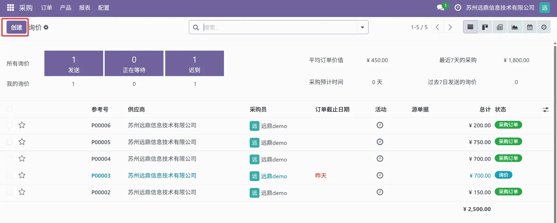 转到采购模块的“订单”菜单,然后点击“询价”(Request for Quotation) 子菜单。