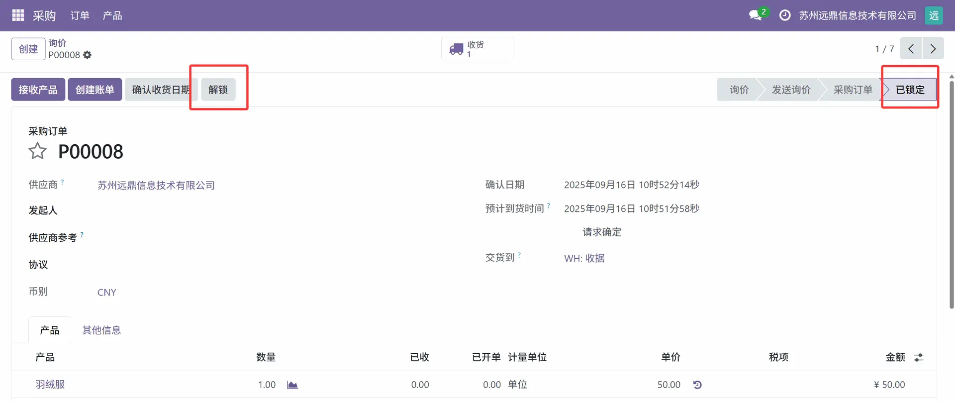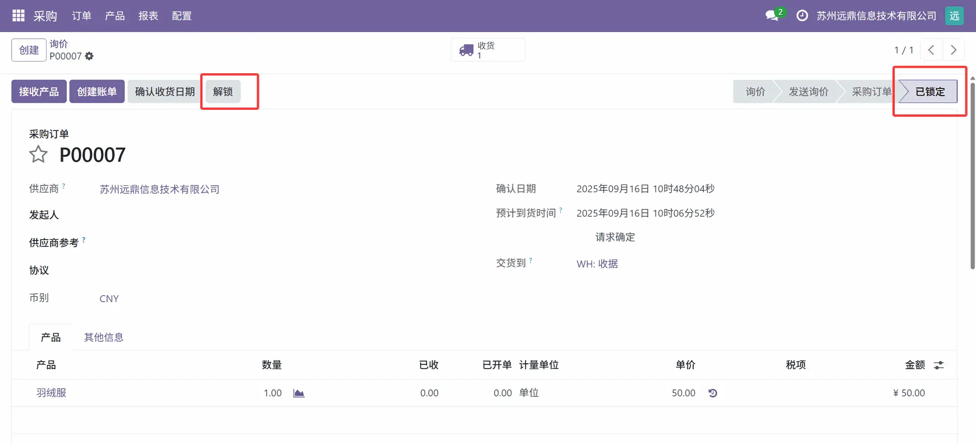 这里可以看到,当询价请求确认后,采购订单处于“已锁定”状态。当采购订单进入锁定状态后,无法再对其进行任何编辑。在某些情况下,根据供应商或公司的指示,用户可能希望更改采购订单,此功能也是可行的。因此,要修改采购订单,用户可以点击上图中标记的“解锁”按钮。