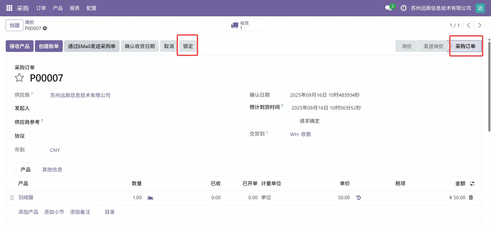 一旦点击“解锁”按钮,订单将被解锁,并从“已锁定”状态移回“采购订单”状态。编辑后,如果客户希望再次将采购订单置于锁定状态,用户可以手动点击采购订单顶部的“锁定”按钮来实现,如上图所示。