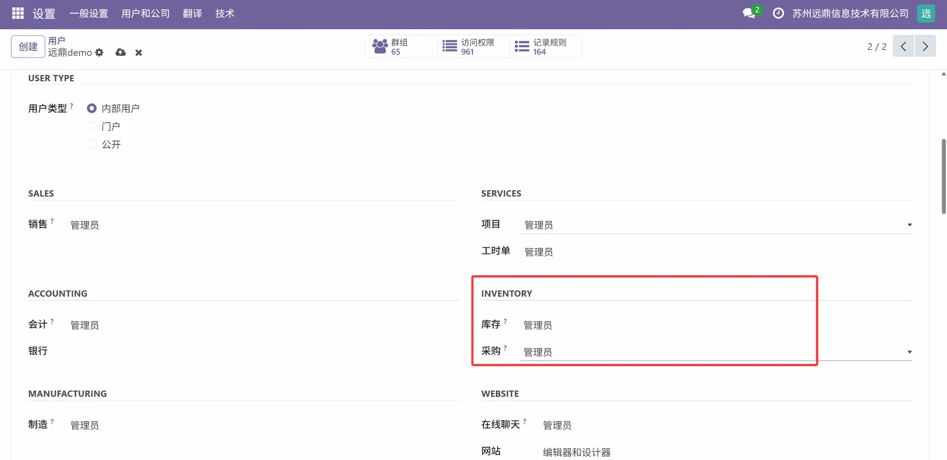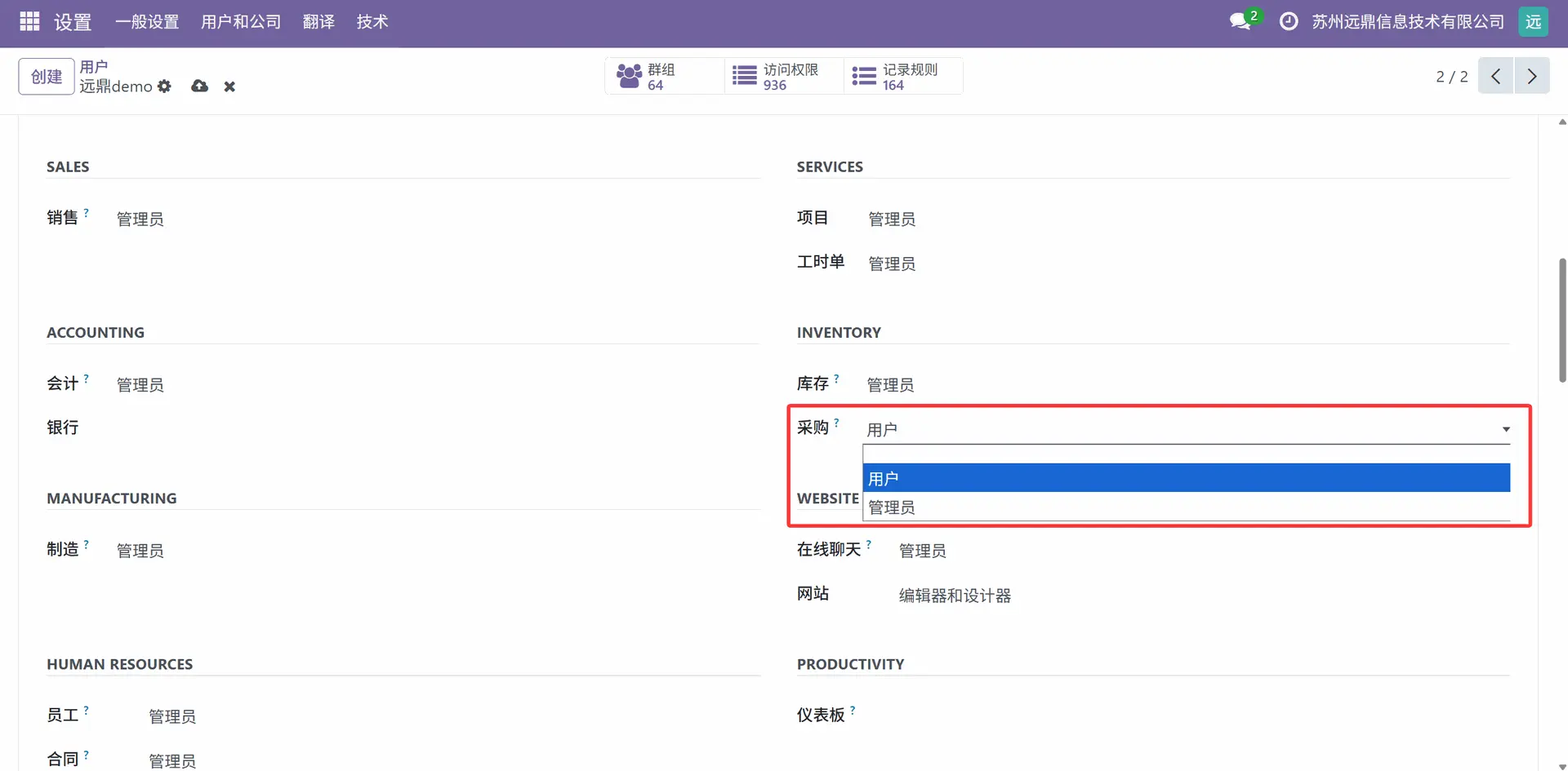 Odoo 采购模块主要有两种访问权限:用户或管理员。当从通用设置中转到“用户”时,选择一个用户,在“库存”部分下有一个“采购”字段。我们可以在那里设置用户的访问权限。