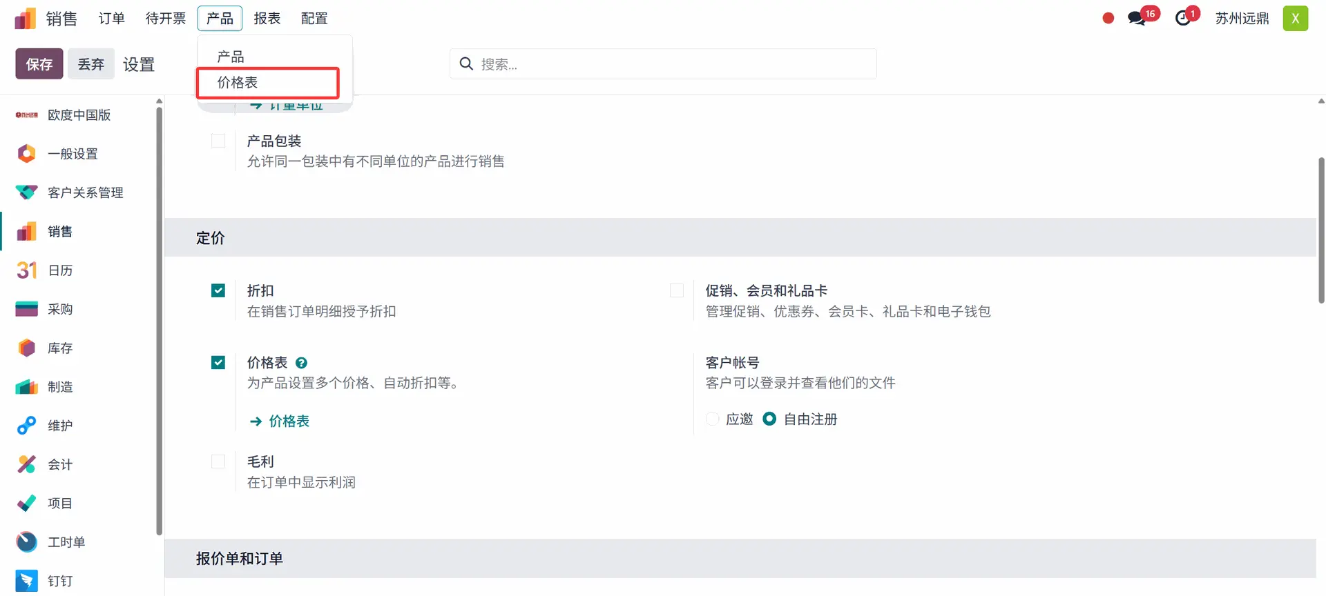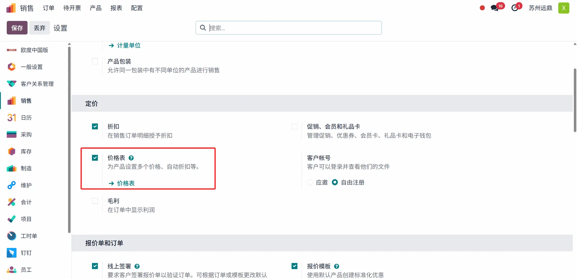 在“定价”(Pricing) 部分下,有一个“价格表”(Pricelist) 选项。启用此布尔选项以在 Odoo 18 销售中使用价格表功能。一旦启用了价格表,在“产品”(Product) 菜单下将会添加一个“价格表”(Pricelist) 菜单。