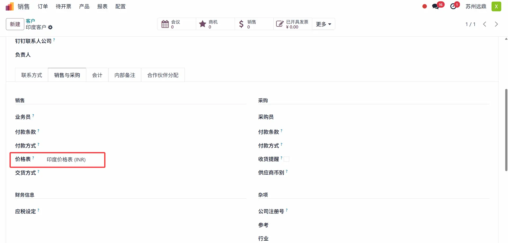 每当创建客户时,Odoo 会自动为该客户设置一个价格表。如果已经配置了特定国家/地区的价格表,并且该价格表中的国家/地区与客户的国家/地区相同,Odoo 会将该价格表设置为此客户的默认价格表。