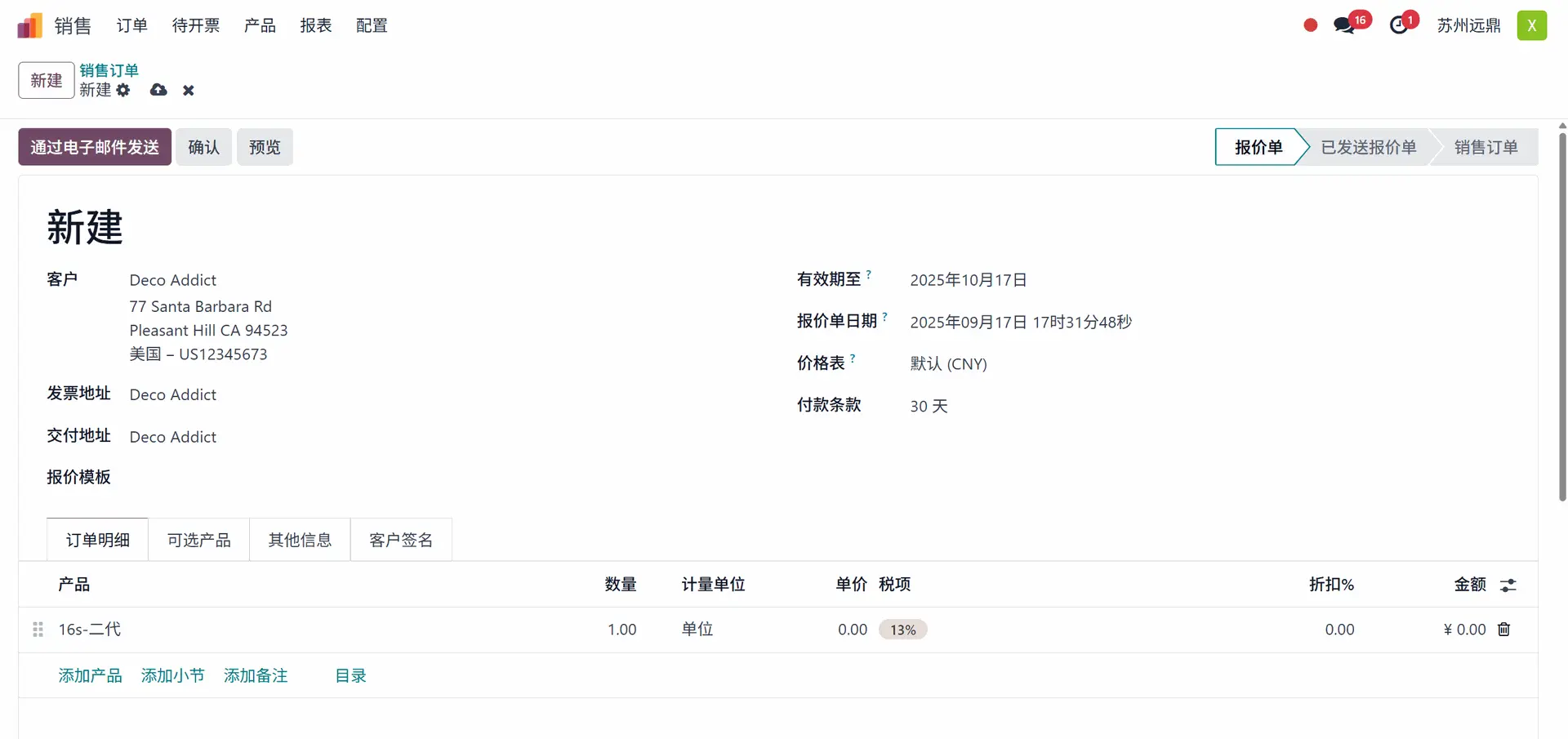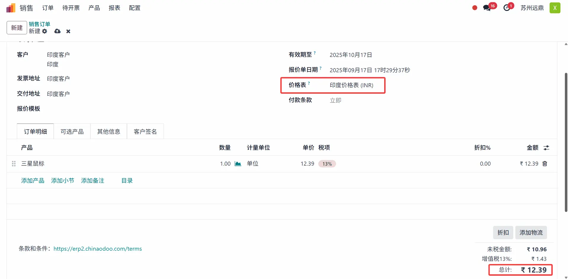 在创建报价单时,只要将该印度合作伙伴添加为报价单的客户,Odoo 会自动将印度价格表设置为该销售订单的默认价格表。这里的价格是以印度卢比 (INR) 显示的。