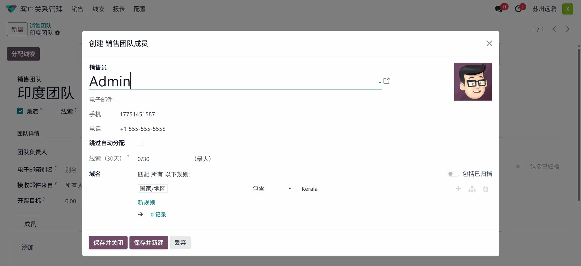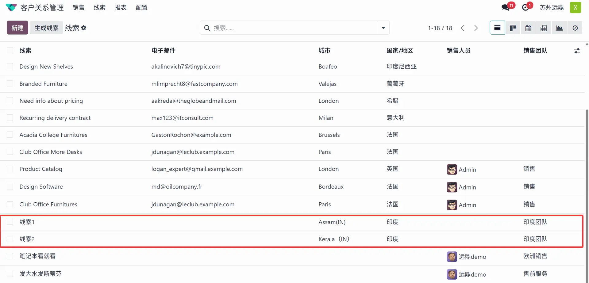 • 线索 2:销售团队=印度团队,销售人员=Admin;