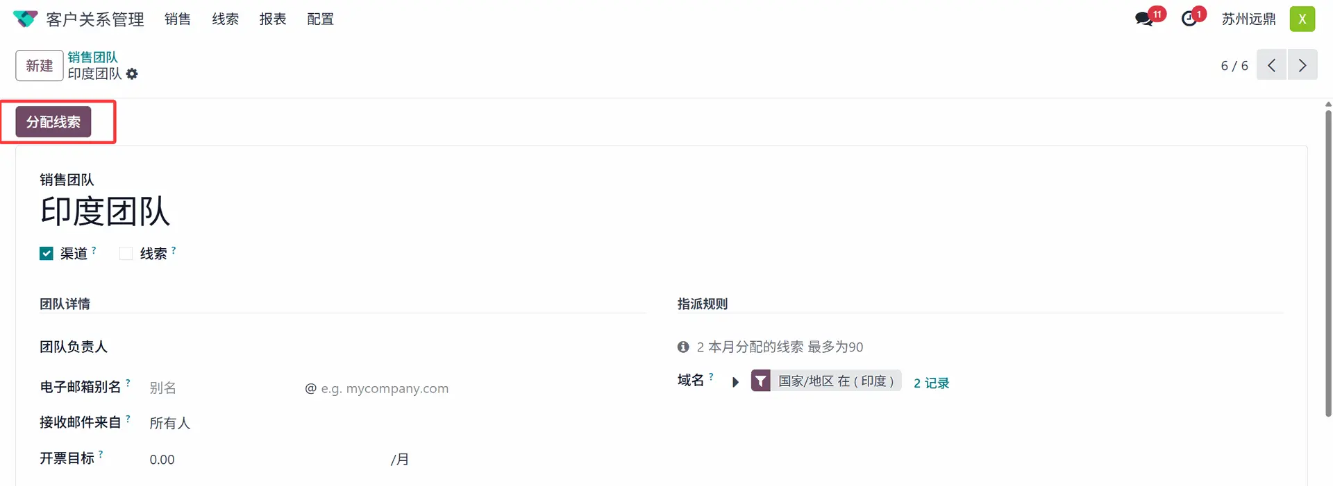 1. 返回“印度团队”详情页,点击顶部【分配线索】按钮;