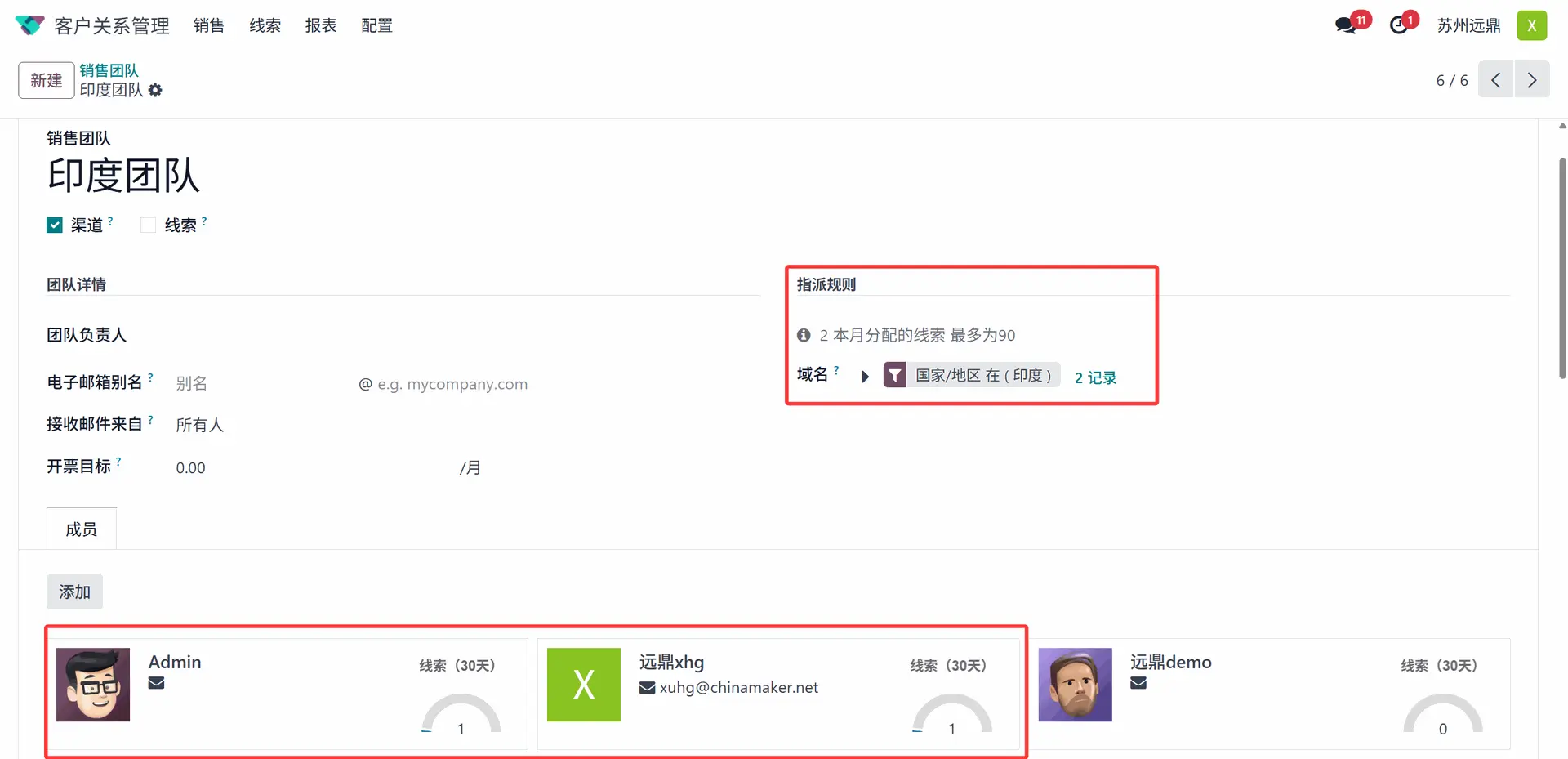 假设企业需求:创建“印度团队”,专门处理来自印度的线索;团队含 3 名成员(Admin、远鼎demo、远鼎xhg),其中 Admin 负责 Kerala 州线索,远鼎xhg 负责印度其他州线索,配置步骤如下: