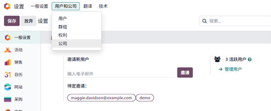 首先,进入 Odoo 19 的设置模块,然后导航至 用户与公司 > 用户,选择相应用户即可管理其角色与访问权限。