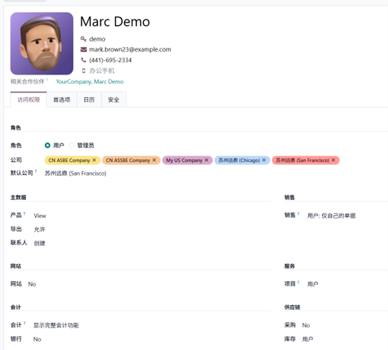 在库存权限中选择用户权限,此处为 Marc Demo 分配了用户权限。