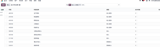 接下来,我们查看会计科目表,了解利润表包含哪些类型的科目。利润表涵盖收入类和费用类科目,具体包括收入、其他收入、费用、其他费用、折旧及营业收入成本相关的入账记录。