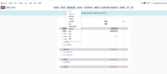 若要查看利润表,点击报告(Reporting)菜单,然后选择报表。在此界面中,点击对应按钮可将利润表导出为 PDF 或 XLSX 格式。