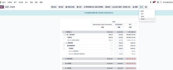 利润表的金额以企业本位币完整单位展示(如人民币、美元)。为便于阅读大额数据,系统支持以千()或百万(M)为单位展示金额,其中符号始终代表企业本位币,并非特指人民币。