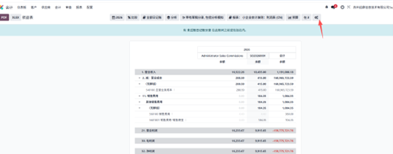 进入利润表界面后,系统会根据默认时间段(通常为当前会计年度)自动生成报表。不过,Odoo 提供了高度灵活性,用户可根据企业特定需求修改该时间范围。用户可选择按月、季度、年或自定义时间生成报表。